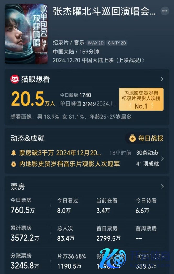 猫眼平台披露,该片上映以来如故冲破多项记载,得到内地影史贺岁档记载片、音乐片不雅影东谈主次榜第别称,内地影史记载片单日总场次榜第别称等名称。面前,灯塔和猫眼平台均展望,该片最终票房有望向上6000万元。