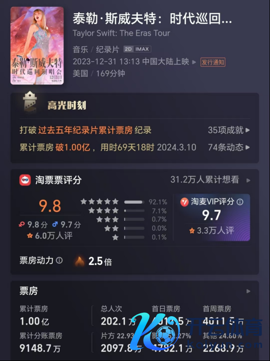 此前,记录全球知绅士行歌手泰勒·斯威夫特2023年时期巡回演唱会音乐现场的电影《泰勒·斯威夫特:时期巡回演唱会》于2023年12月31日在国内上映。