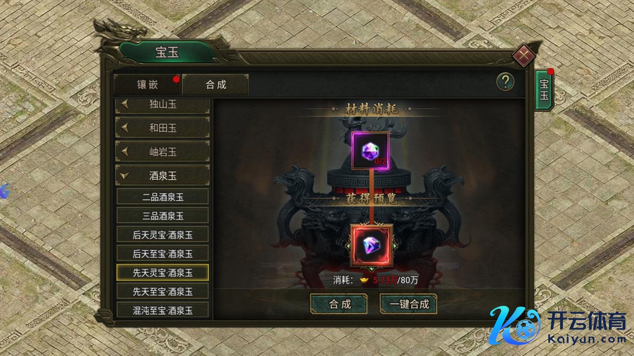 高阶合成:后天灵宝及以上等第,需要2个同等第、同类型宝玉,等第越高所需材料越多,提倡攒王人材料再合成,幸免铺张。