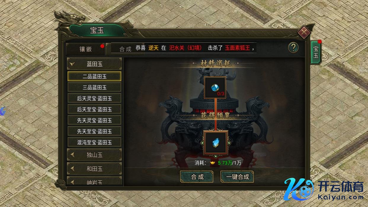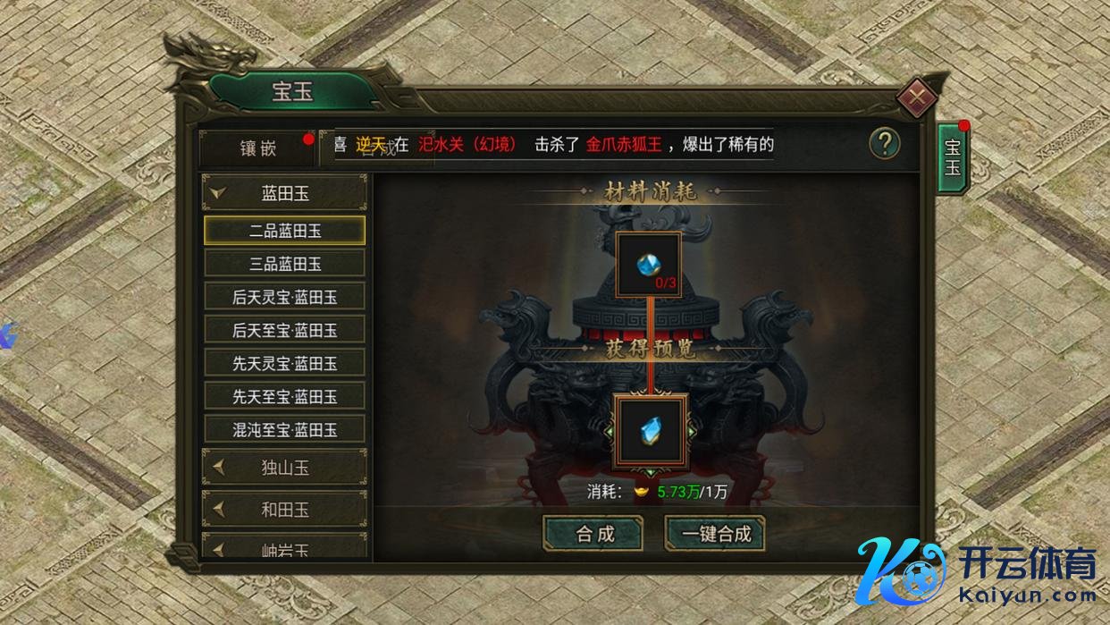 基础合成:3个同等第、同类型宝玉,可合成1个更高级第宝玉(比如3个一品蓝田玉=1个二品蓝田玉)。
